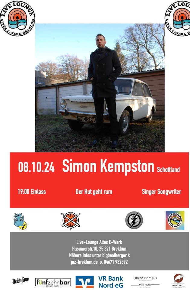 Am Dienstag, den 08.10.24 begrüßen wir Simon Kempston in der Live Lounge Breklum. Der Eintritt ist frei, der Hut geht rum. Einlass: 19:00 Uhr/Konzertbeginn: 20:00 Uhr.
